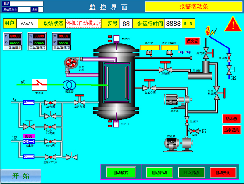通過我們公司的系統(tǒng)可以時(shí)時(shí)監(jiān)控水壓、電壓、氣壓。能按工藝自動(dòng)完成生產(chǎn)。有效的節(jié)省人力、物力等方面的成本。提高了產(chǎn)品的合格率。為公司創(chuàng)造更大的利潤。我們的軟件廣泛用于高真空釬焊爐、石墨化爐、碳化爐、TP爐、熔煉爐、碳化硅燒結(jié)爐、金屬鉭片爐、鎢絲高溫真空爐、藍(lán)鎢爐等